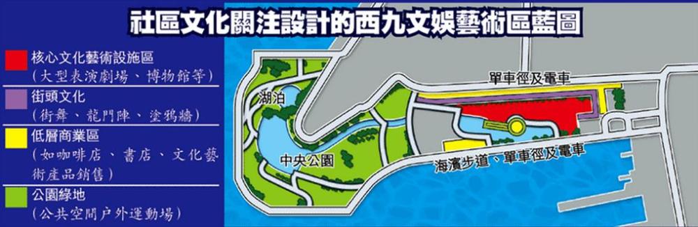 In July 2003, the Town Planning Board approved the idea. The board amended the South West Kowloon Outline Zoning Plan, which rezoned over 20 hectares of ‘Open Space’ into land for ‘Other Use’ and specified its purpose for Arts, Culture, Commercial and Recreational. After the decision was made, only 23.09 hectares of open space is left in the West Kowloon Reclamation Area.